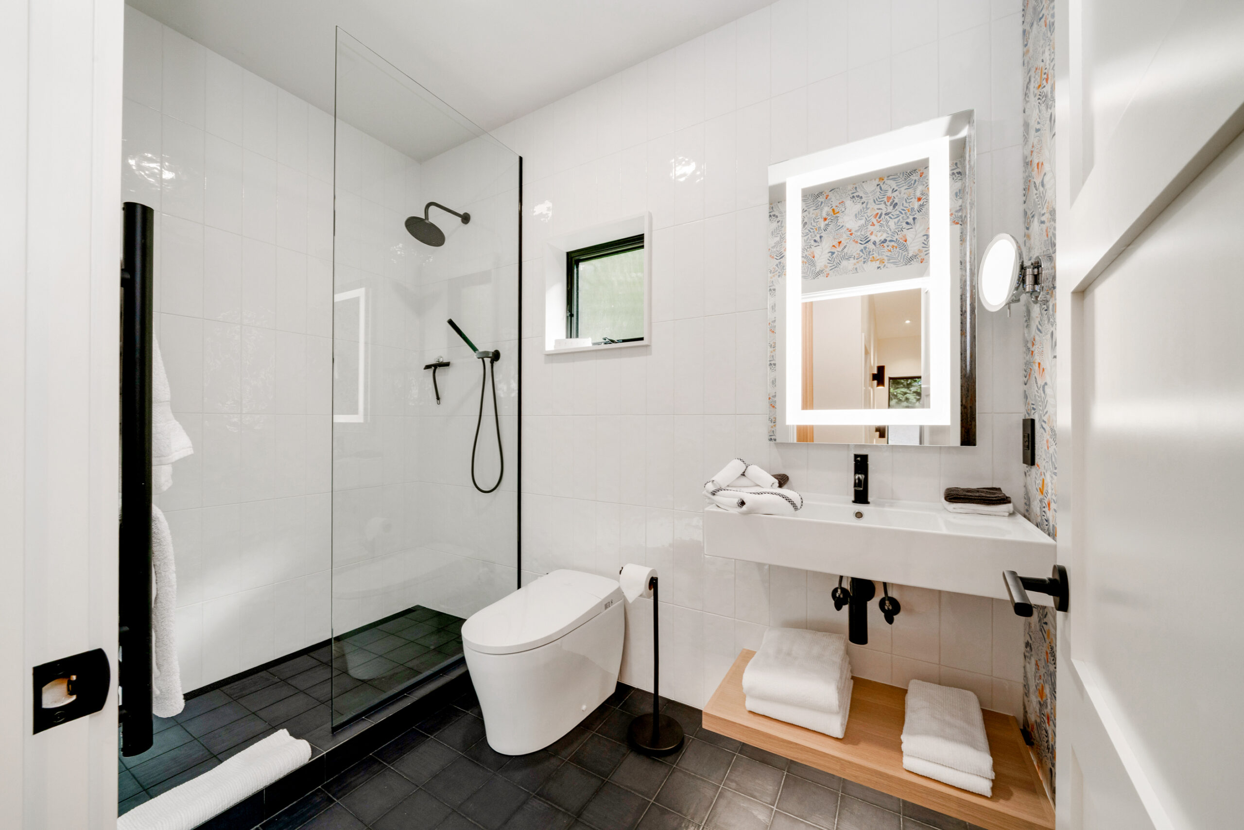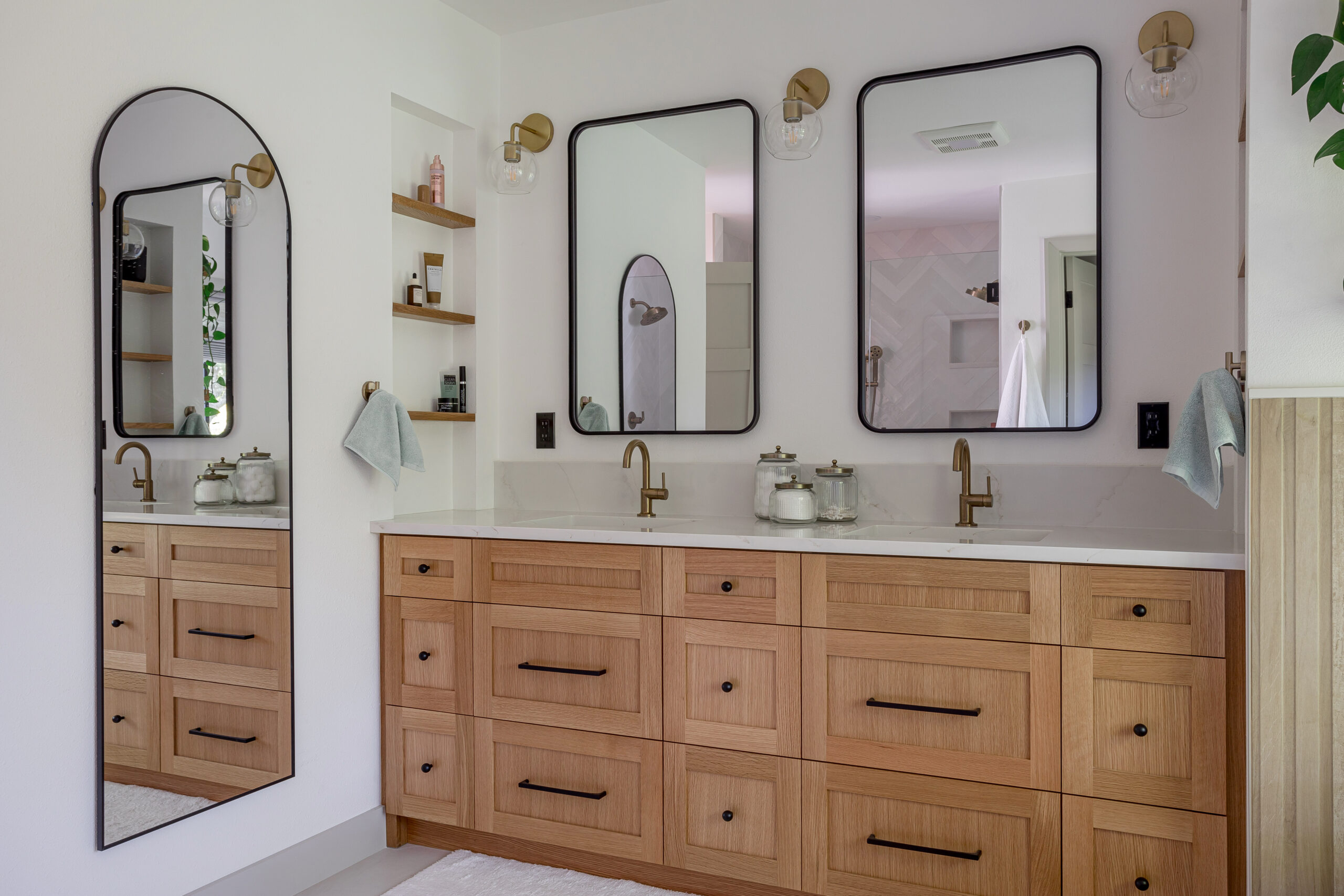 Built-in linen cabinets and floating shelves